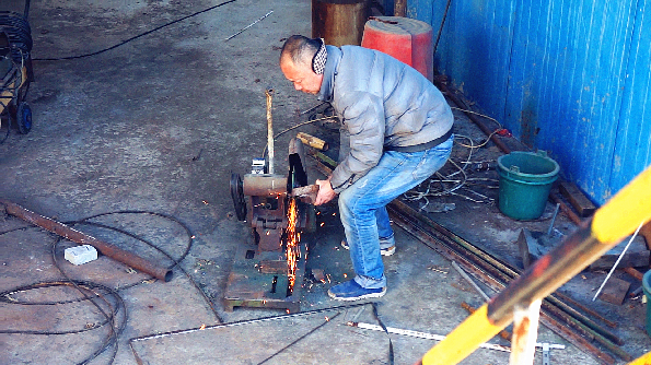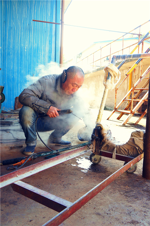 紧邻汰头废水处理池旁的工棚——公司专门焊接的地方迎来一位男子,他刚把从车间推来的小车放好,便打开电焊机,时而弯腰把焊条对准焊点打出火花,时而蹲下仔细查看焊接点的牢固程度,在四面漏风的工棚里干得热火朝天。这位男士便是兰恒亮师傅,只用了一会功夫,他就把这辆刚刚推来的小车扶手处焊接得紧实牢靠。
