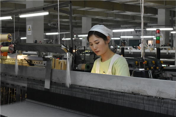 几十台剑杆织机同时开动,发出的轰鸣声响彻工厂,寻着机台上明亮的灯光,走近其中,声音越来越响,机台运转产生的高频次振动,甚至脚底也感受得异常分明。抬眼远望,几十台织机整齐排列,女工们来回穿梭,埋头苦干,气定神闲。
