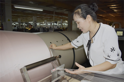 厂学习,有时候一待就是近一个星期。由于行业竞争等因素,她每次去别的厂家学习都只能远远地看着,就算有问题提出来,对方也只是支支吾吾、避重就轻。丁敏很是着急,公司派来学习不能只学到点皮毛就回去啊!于是,她主动跟工人们热络起来,借机要来牵经用的卡纸,上面写着总经数、摆筒数、门幅等关键数据,她悄悄地带回来后,就请唐贺强主任一起帮忙反复验算,最终得出牵经所需的关键工艺指标。就这样,她在同事和领导的帮助下,不停地验算测试,一次次地牵经落经,最终熟练掌握了牵经机的使用,攻克了一个又一个技术难关。