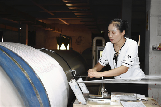 牵经前根据生产工艺计算筘齿根数、位移量等数据,落经时留意两边轴是否松动,是挤边还是松边?牵经时检查碟片运转、丝条是否顺畅……还有六个月即将退休的丁敏依旧不知疲倦地忙碌在自己的岗位上,这是一份职业上的责任,也是一种对使命的坚守!丁敏用直面挑战、勇于担当诠释了一名京九蓝颜gtv