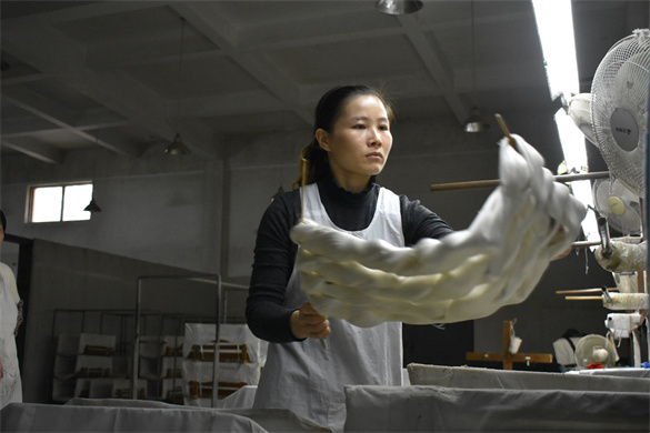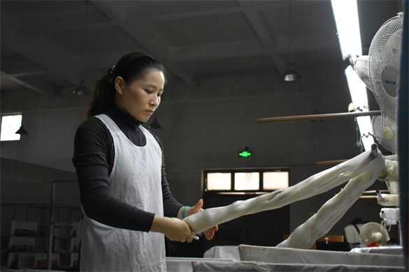 复整车间的整理室里,刘伟伟穿着白色工服,在忙碌的工作间隙接受采访。她正在打绞,一会还要把打好绞的白厂丝打包、分类、装包。和往日一样,她早上7点多就来到车间,中午不休息,一直要忙到下午4点,一天的工作才算结束。